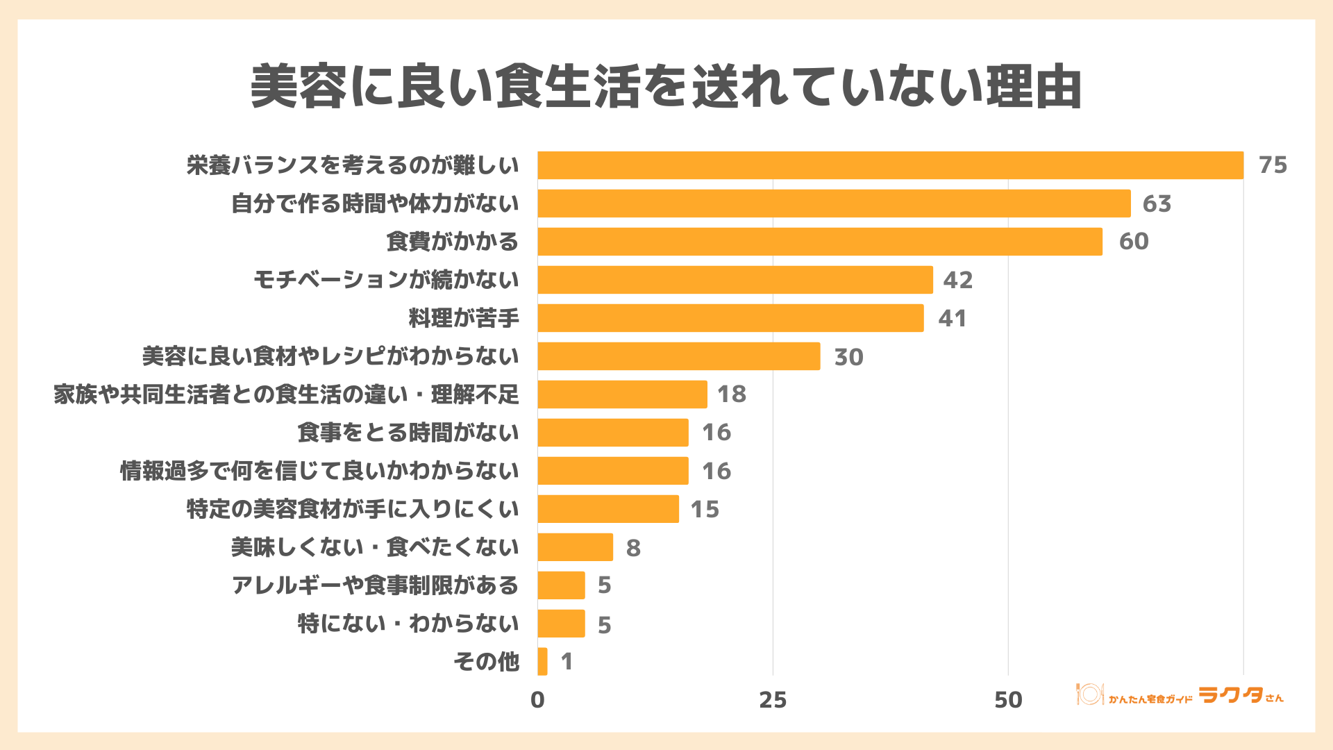 美容に良い食生活を「送れていない」「どちらかと言うと送れていない」と回答した155人にその理由を聞きました(複数回答可)。最も多かったのは「栄養バランスを考えるのが難しい」で75人。「自分で作る時間や体力がない」が63人、「食費がかかる」が60人と続きます。