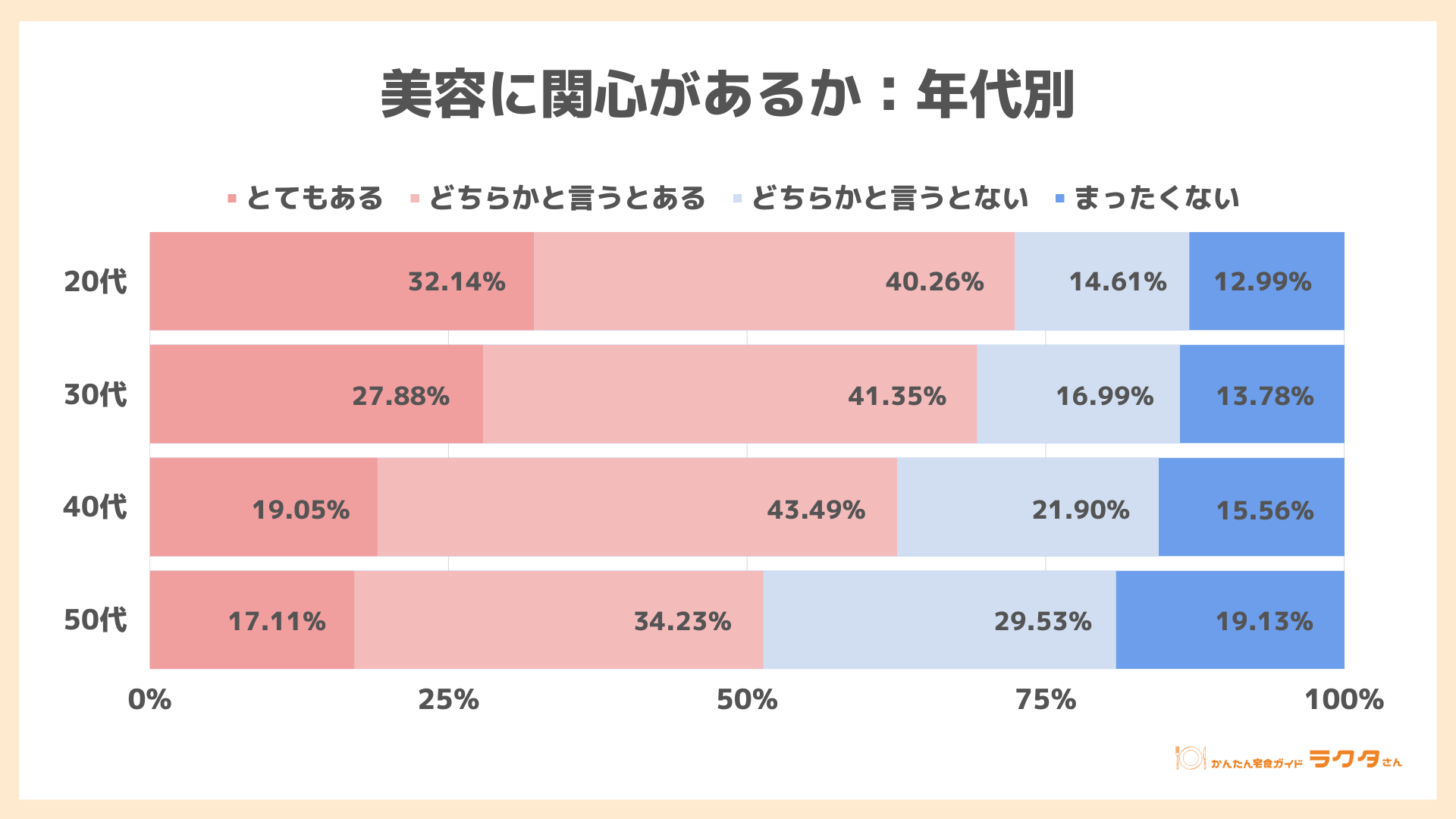 「とてもある」「どちらかと言うとある」と回答した割合は、20代が72.4%、30代が69.23%、40代が62.54%、そして50代が51.34%となっています。これらのデータから、特に若い世代で美容への関心が高く、年齢が上がるにつれてその関心度が徐々に低下する傾向が読み取れます。