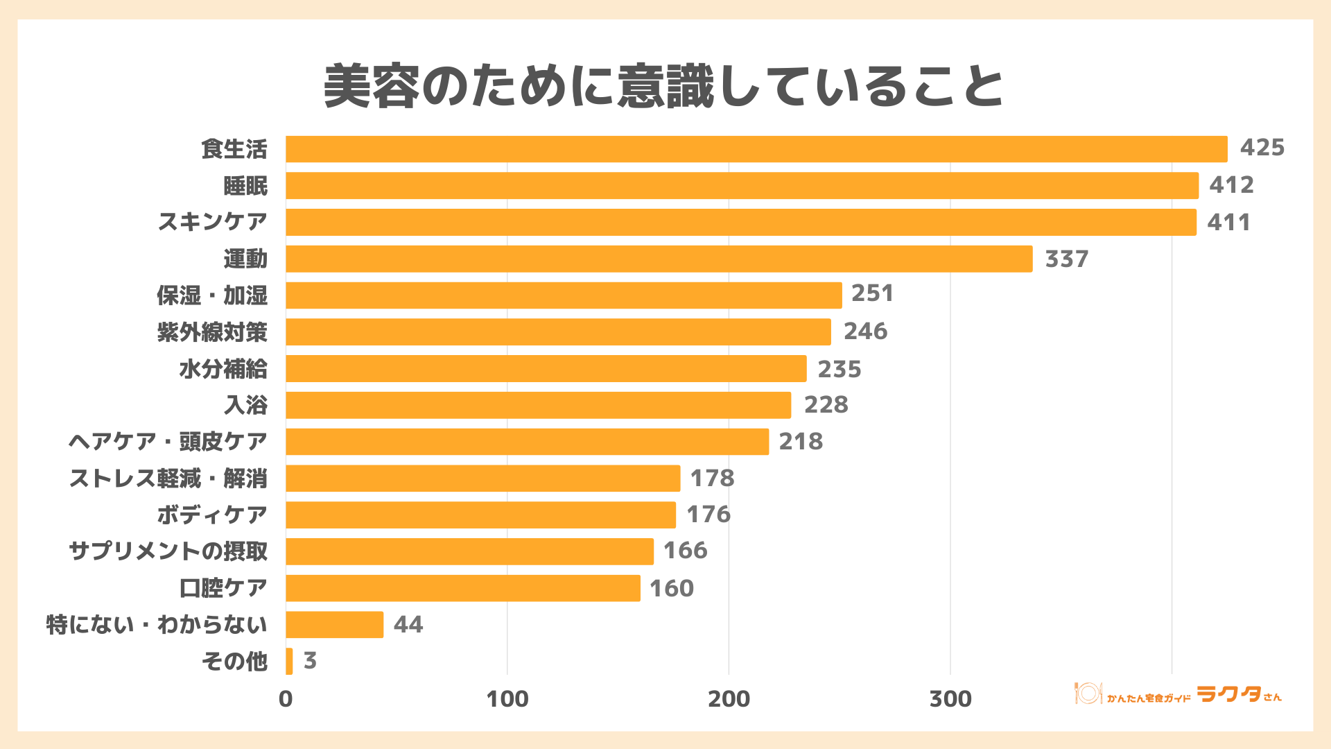 最も多かったのは「食生活」で425人。そのあとに「睡眠」412人、「スキンケア」411人、「運動」337人と続きます。日常生活と密接に関わりのある食や睡眠への関心が高いようです。