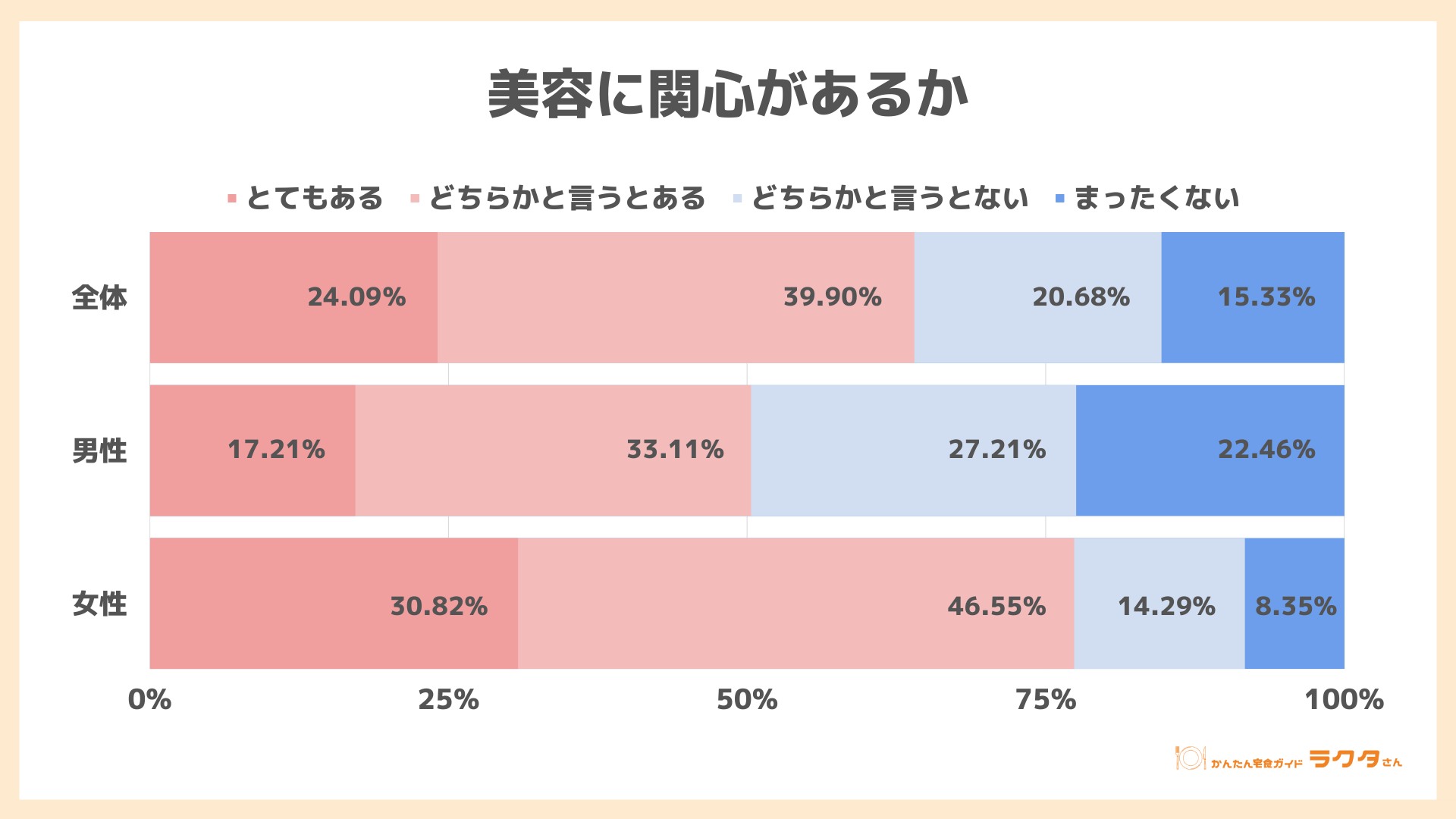 男女別の結果では、男性は「とてもある」が17.21%、「どちらかと言うとある」が33.11%で、美容に関心があると答えた男性は約50%。一方、女性は「とてもある」が30.82%、「どちらかと言うとある」が46.55%と、美容に対する関心度が高く、全体の約80%が美容に関心があると答えました。