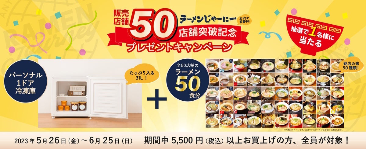 本キャンペーンでは、「ラーメンじゃーにー」の全販売店舗から人気ラーメンを1食ずつ、合計で冷凍ラーメン50食をプレゼント。ご自宅の冷凍庫に入りきらない量なので、セカンド冷凍庫として便利な1ドア冷凍庫(31L)もお付けします。北は北海道から南は鹿児島まで、全国の銘店のラーメンをご自宅でお楽しみいただけるキャンペーンです。