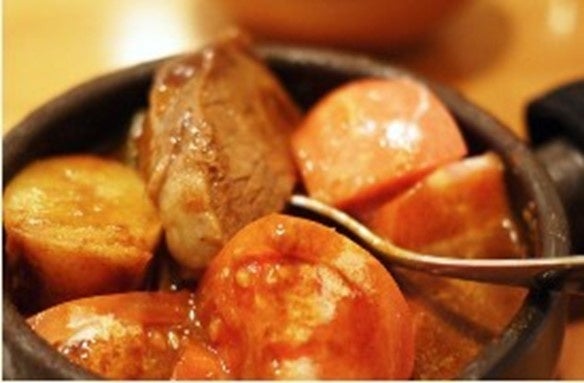 カレーは、ルウとご飯が別々に提供されるスタイル。「チキントマトマレー」のルウは、アツアツの鉄鍋に入っています。中には、生のトマトがたっぷり。食べ進めるうちに、鉄鍋の熱で次第にトマトが柔らかくなり、また異なる食感や味わいを楽しむことができます。トマト好きにはたまらない一皿です。