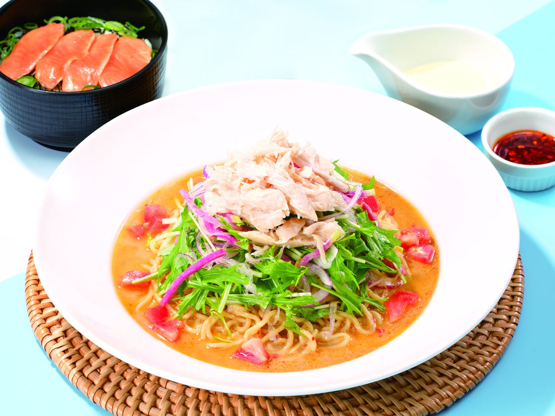 茹でた後にしっかり冷やすことでもちもち食感に仕上げた細麺に、水菜や紫たまねぎ、紅心大根、トマトなどのみずみずしい野菜をたっぷりとのせ、さらにしっとり柔らかい蒸し鶏をトッピングしました。ごまだれの香ばしい風味とコクが、野菜と蒸し鶏に絡み、素材の味を引き立てます。