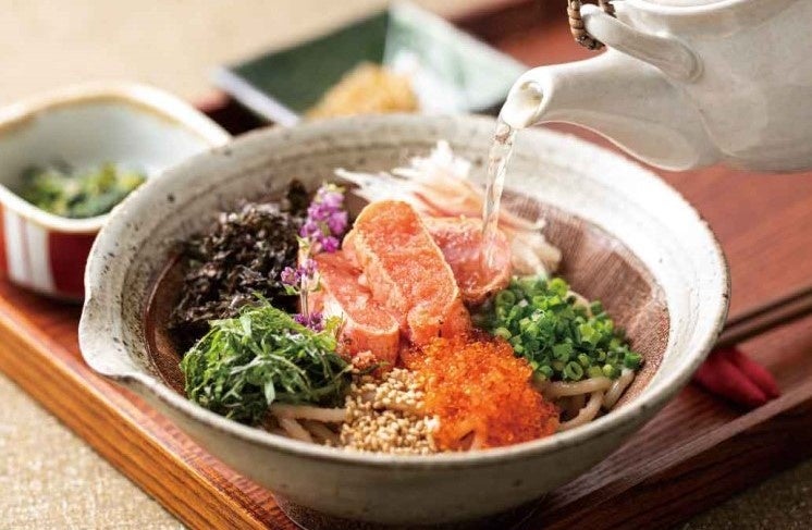 たらこを絡めたもちもち生パスタの上に炙りたらことプチプチとした食感が楽しいとびこをのせました。さらに大葉、みょうが、しその実などの薬味をたっぷりトッピングした食べ応え抜群のメニューです。お出汁をかけてスープパスタとしてもお楽しみいただけます。