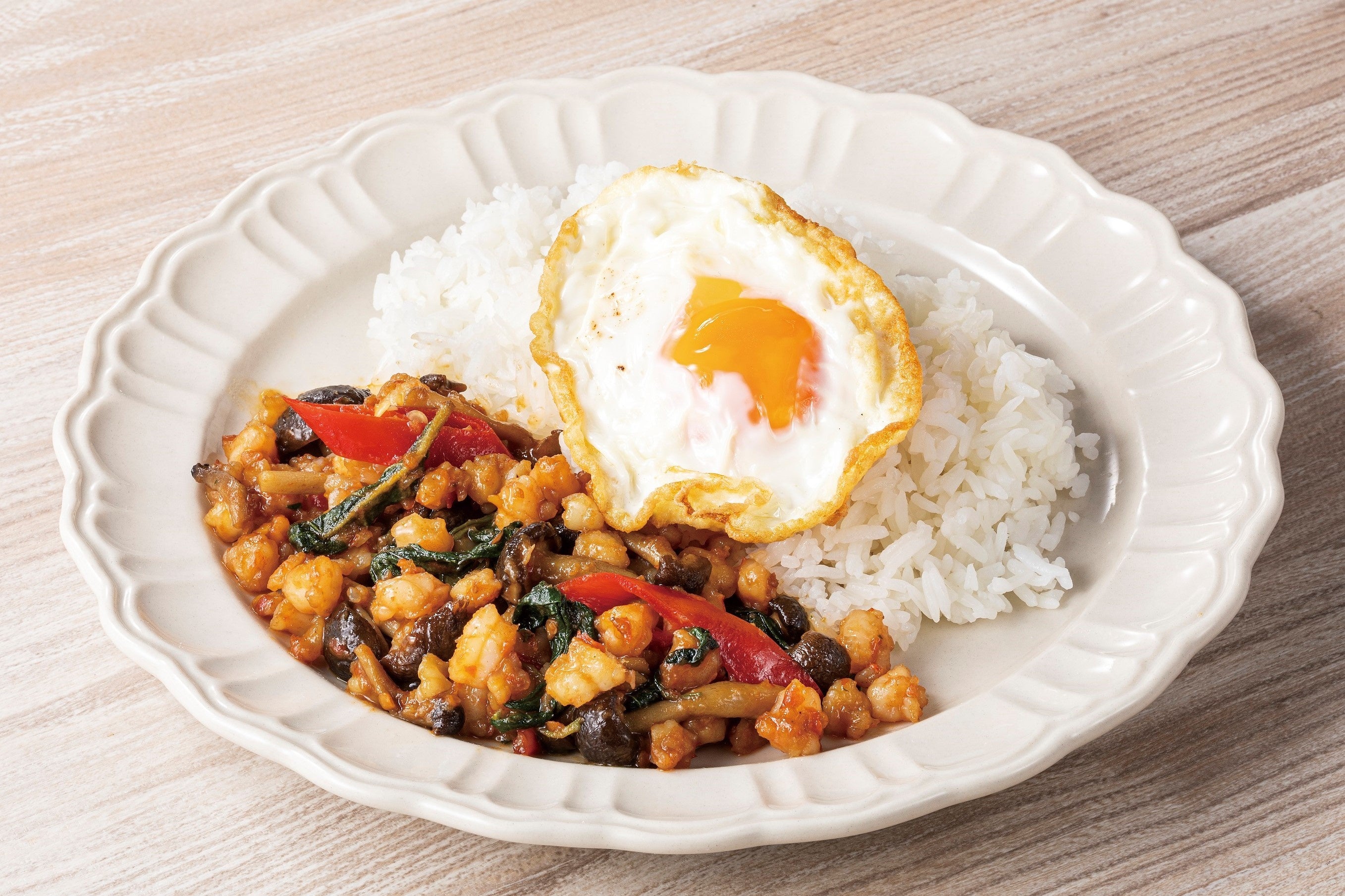 そぼろ状の海老が濃いめのガパオ味となじんで、ジャスミンライスとの相性もぴったり。
