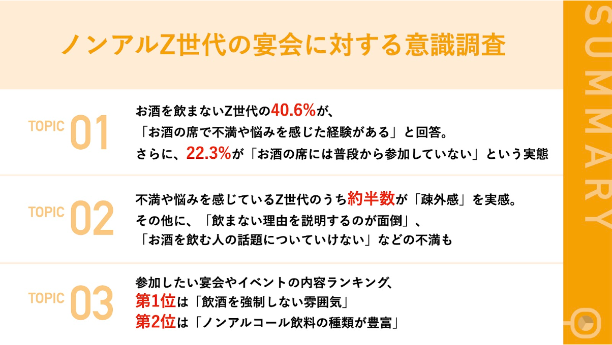 今回の調査では、普段からお酒を飲まないZ世代がお酒の席に参加する際に、場の雰囲気を壊さない工夫を色々としているものの、不満や悩みを感じていることが分かりました。回答者の22.3%は「お酒の席には普段から参加しない」と回答しており、お酒の席への苦手意識が浮き彫りとなる結果となりました。苦手意識を感じる背景には、疎外感以外にも飲酒の強要やテンションの違いだけでなく、自身がお酒を飲まないことで雰囲気を壊しているのではないかという自責の念などがあり、イベントを開催する際は、お酒を飲まない人も楽しく過ごせるような工夫が求められています。