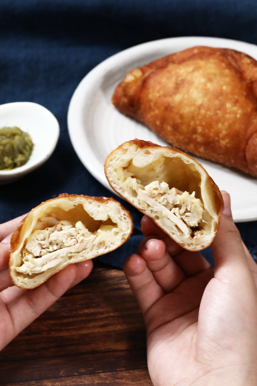 ・柚子胡椒で味付けをした桜島どりを包んだ揚げピッツァ。