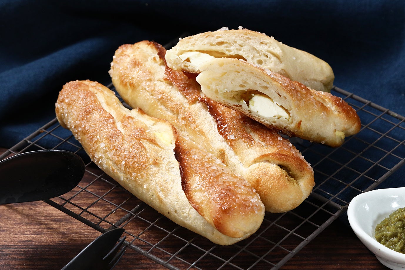 柚子胡椒とザラメを掛け合わせた「菓子系惣菜パン」。フランス生地でクリームチーズと柚子胡椒を包み、ザラメをトッピングして焼き上げました。クリームチーズのコクとともに、酸味、辛味、甘味の絶妙なバランスをお楽しみいただけます。