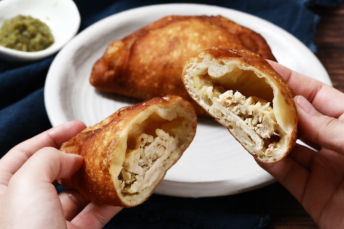 ・柚子胡椒で味付けをした桜島どりを包んだ揚げピッツァ。