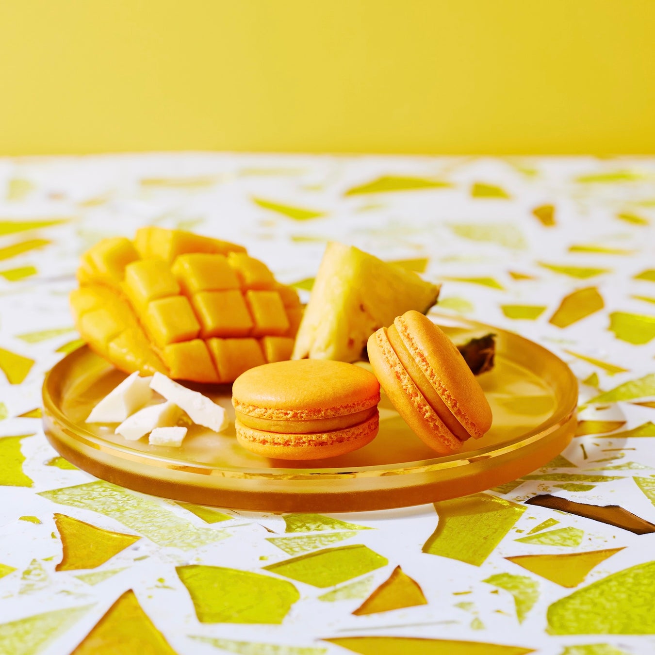 濃厚な甘みのアルフォンソマンゴーとパイナップルの爽やかな味わいは、リンツのチョコレートを使用した「デリース」と呼ばれるマカロンでもお楽しみいただけます。マンゴーの芳醇な香りと、後味のパイナップルの爽やかな余韻をご堪能ください。