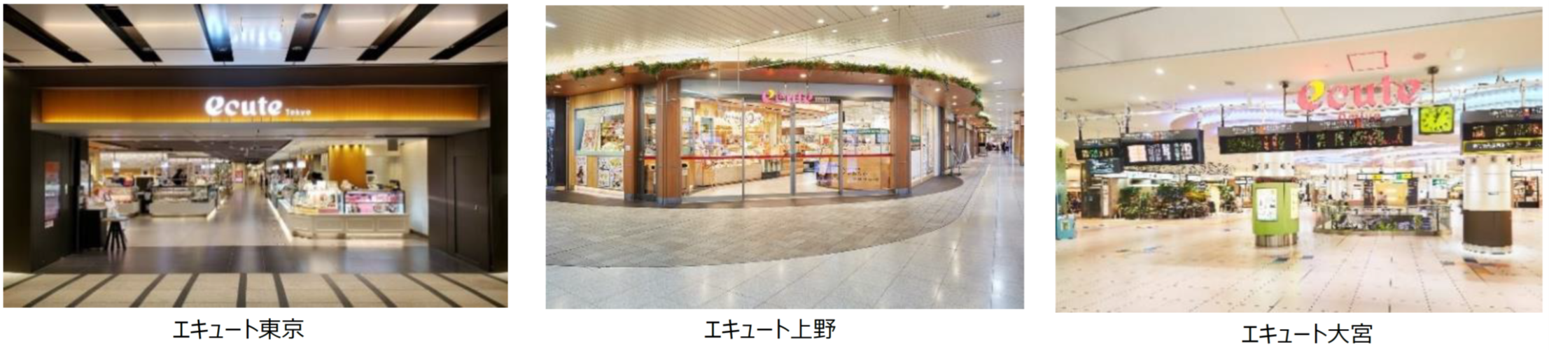 首都圏のターミナル駅構内にあるエキナカ商業施設。「ecute」とは、「駅(eki)を中心(center)にあらゆる人々(universal)が集い(together)楽しむ(enjoy)快適空間に、「生まれ変わる」ということを願うという意味を込めています。また、その音感から、「楽しいことがキューっと詰まっている駅」を表しています。運営する施設は、大宮、大宮 ノース、日暮里、上野、東京、品川、立川の7施設です。