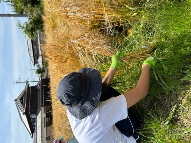 現在、加東市のもち麦畑で刈り取られたもち麦の麦わらは、不要なものとして廃棄や焼却されています。この日刈り取ったもち麦は、そのまま乾燥させ、加東市もち麦活用協議会や社高校の生徒たちにより、麦わらのワークショップ等を通してアップサイクルの方法を検討するのに活用される予定です。