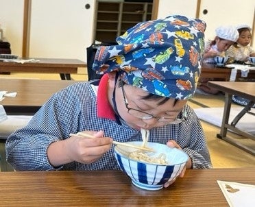 社高校生活科学科の課題研究の授業で「地方創生」を選考する生徒たち(以下、地方創生班)が、地元産のもち麦を活用して「地域を元気にする活動」を始めて、今年で5年目になります。地方創生班の活動は、もち麦を使った商品開発から、イベントの企画・運営まで多岐に渡ります。この日は、地元の製麺業遠藤コンス株式会社(加東市上滝野)の齋藤さんと共に、もち麦うどん打ちの先生として子どもたちの前でデモンストレーションを行いました。加東市では、「もち麦うどん打ち体験」を行う度に地方創生班の3年生が代々先生となって子どもたちを楽しませており、人気のイベントとして定着しつつあります。