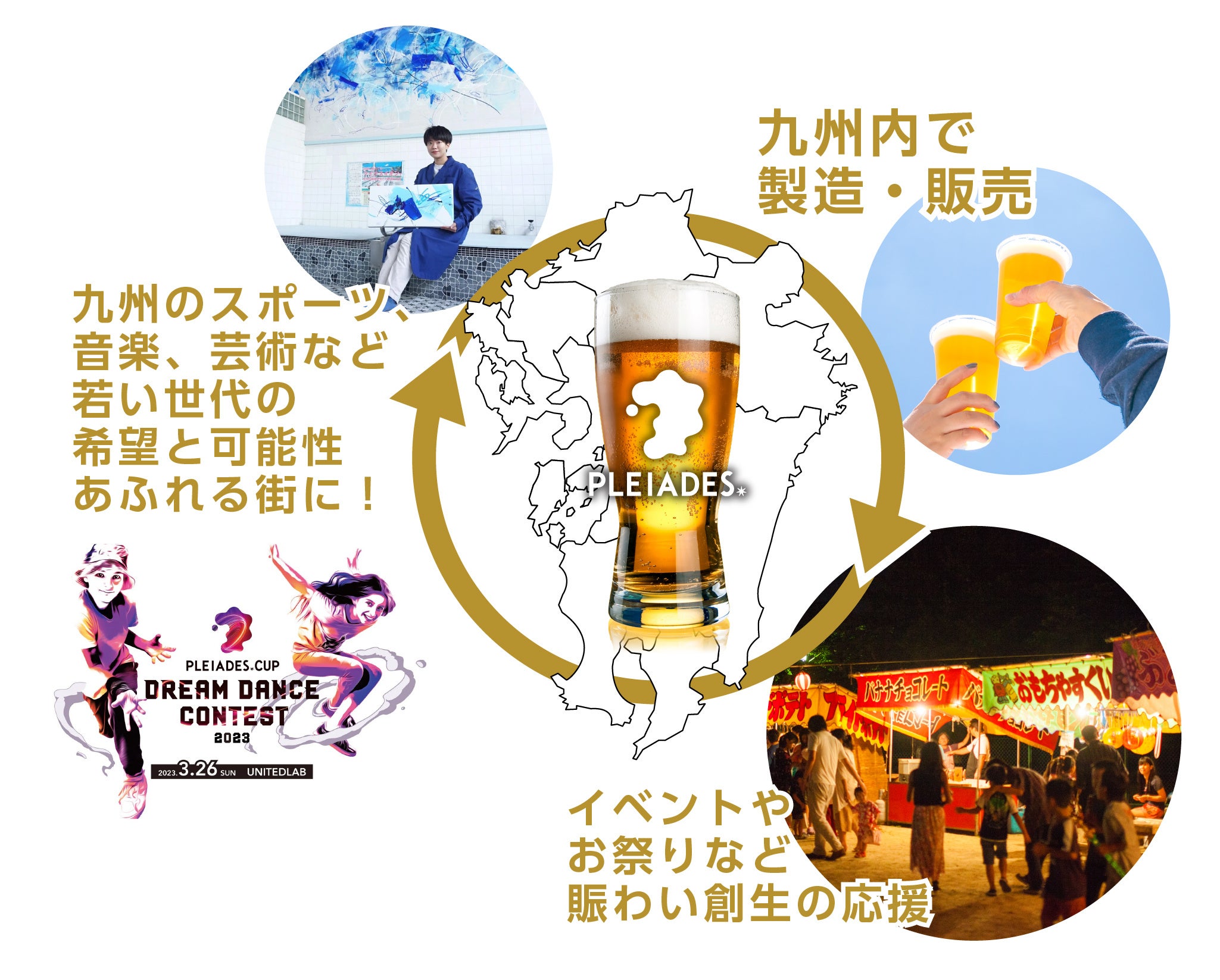 福岡・九州のスポーツ・アート・音楽・ダンスなどのスポンサードや大会の開催を通じ、その収益の一部が地域に還元される、「飲めば飲むほど人も街も幸せになる」ことをコンセプトにした、これまでにない新しい形でお届けする九州発のビールです。