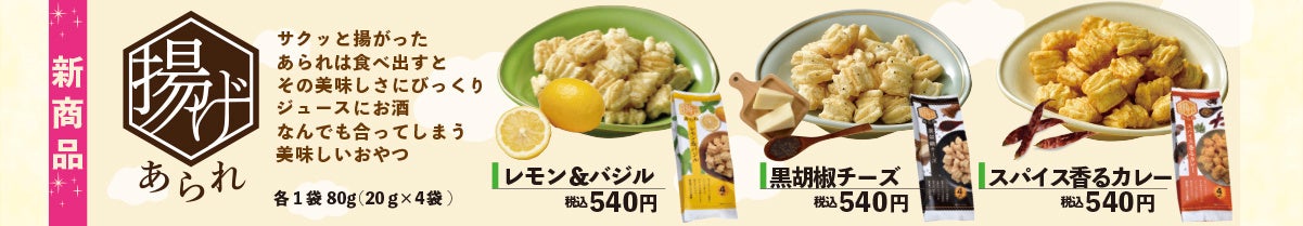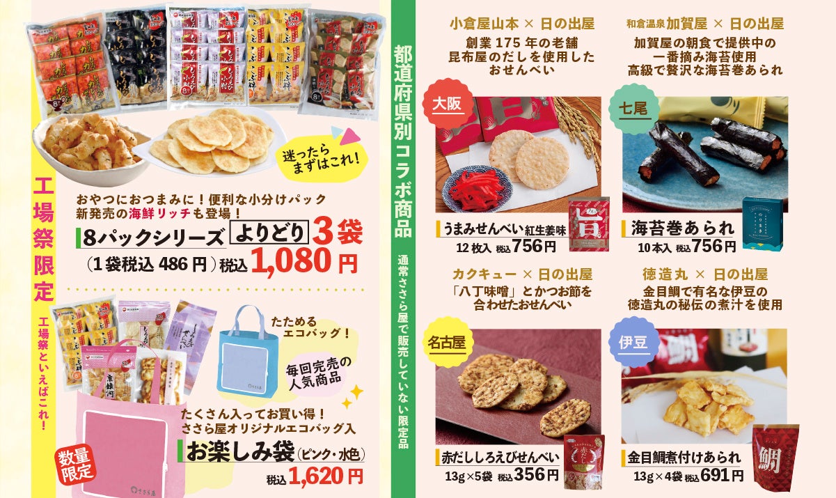 新商品の「揚げあられ」3品をはじめ、工場祭限定の8パックシリーズよりどり3袋、ささら屋オリジナルトートバッグ入り詰め合わせ「おたのしみ袋」、通常ささら屋では販売していない、都道府県別コラボ商品5品なども販売。ささら屋のおすすめ米菓と北陸の美味しい食べ物を取り揃えて、皆さまのご来店をお待ちしています!