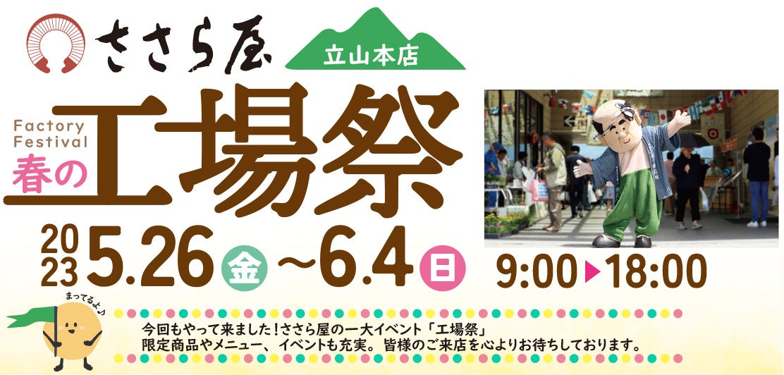 毎回好評のささら屋オススメの富山県内の人気グルメ店が集まる「ささら屋うまいもの市」も土日限定で開催します。当社の商品だけでなく、地元・富山の美味しい食材やグルメ、すてきな逸品を広くお客様に知っていただく機会になればと考えています。