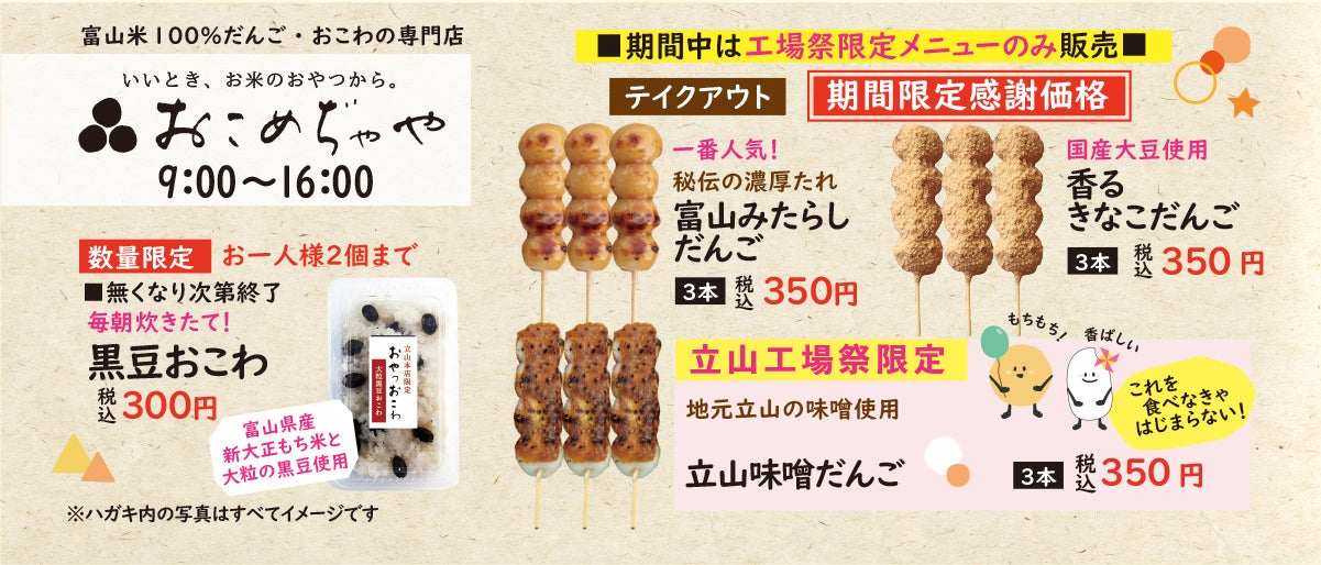 立山工場祭名物の富山米100%のおこめぢゃやのだんご・おこわを【数量限定・感謝価格】で毎日販売。地元立山の味噌を使用した、立山工場祭限定 立山味噌だんごも販売いたします。