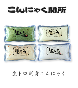 こんにゃくの日(5月29日)から3日間(5月31日迄)限定!こんにゃく関所店舗にて「生とろ刺身こんにゃく」を3つ以上お買い上げいただいたお客様に、お好きな「生とろ刺身こんにゃく」を1つプレゼント。詳しくは店頭にてお問い合わせください。