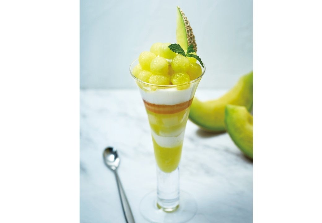 甘くてジューシーな静岡産マスクメロンとモロゾフのカスタードプリンのマリアージュをお楽しみいただけます。バニラとヨーグルトのアイス、ナタデココで仕立てた期間限定のパフェです。