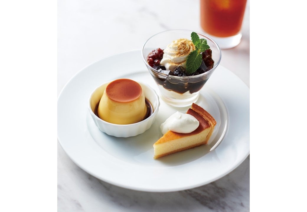 カスタードプリン(ミニ)、デンマーククリームチーズケーキと口当たりの良いデザートサイズのコーヒーゼリーパフェをワンプレートに盛り合わせました。