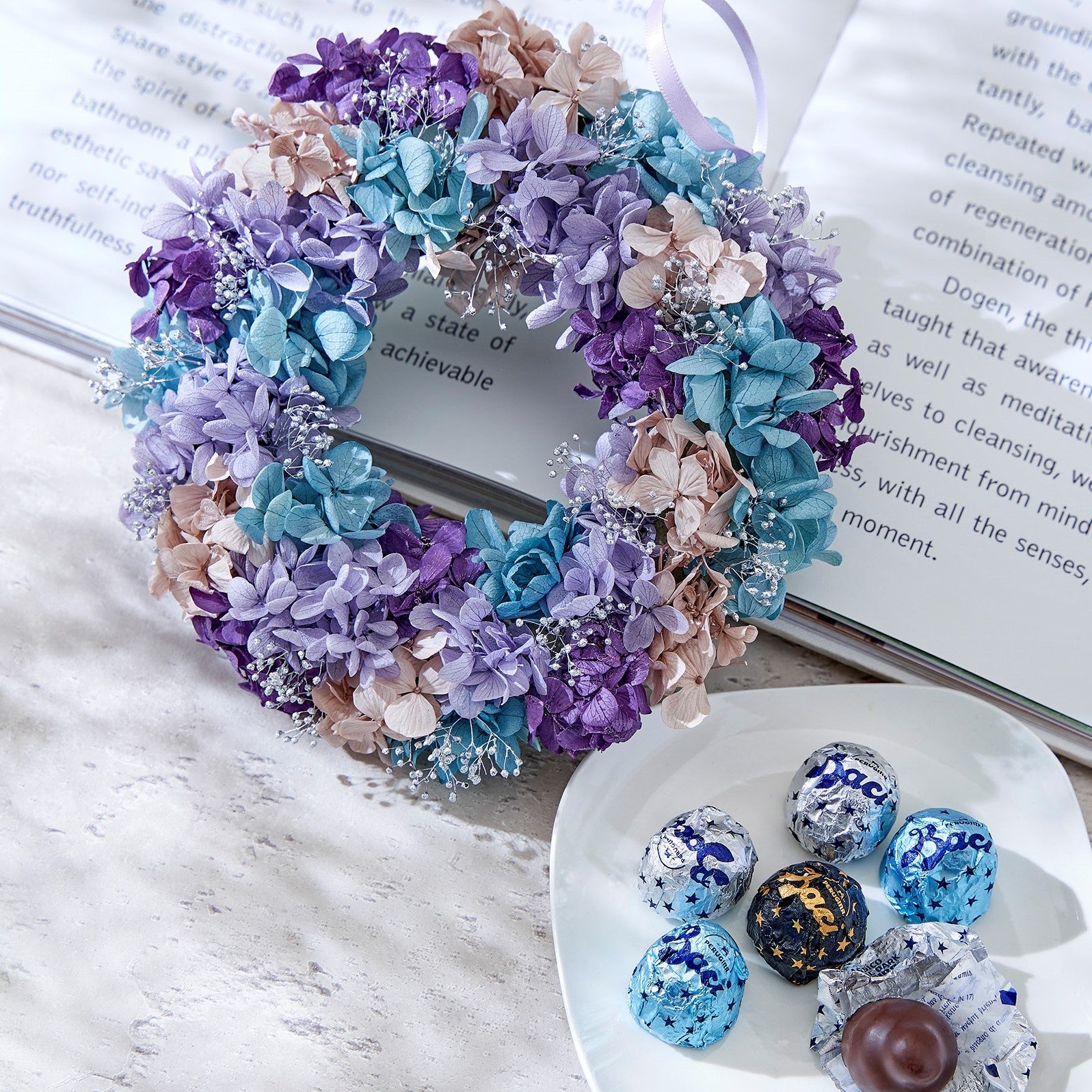 日比谷花壇プロデュース:アジサイを使ったリース バッチ特別デザイン×1(幅約19x奥行約19x高さ約4.5cm、プリザーブドフラワー使用)