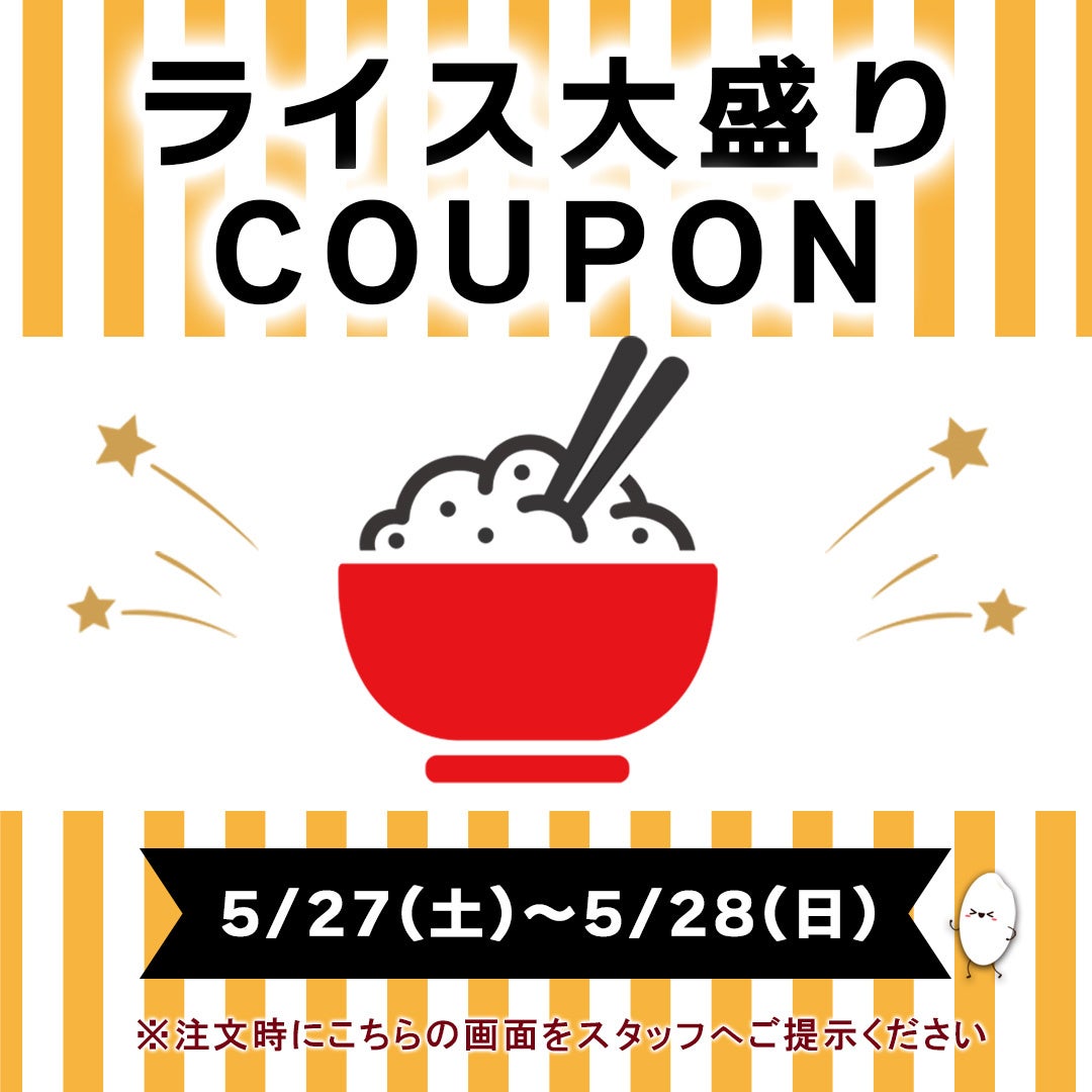 5月27日(土)・28日(日)限定で【ライス大盛り無料】になる見せるだけクーポンを配布いたします!
