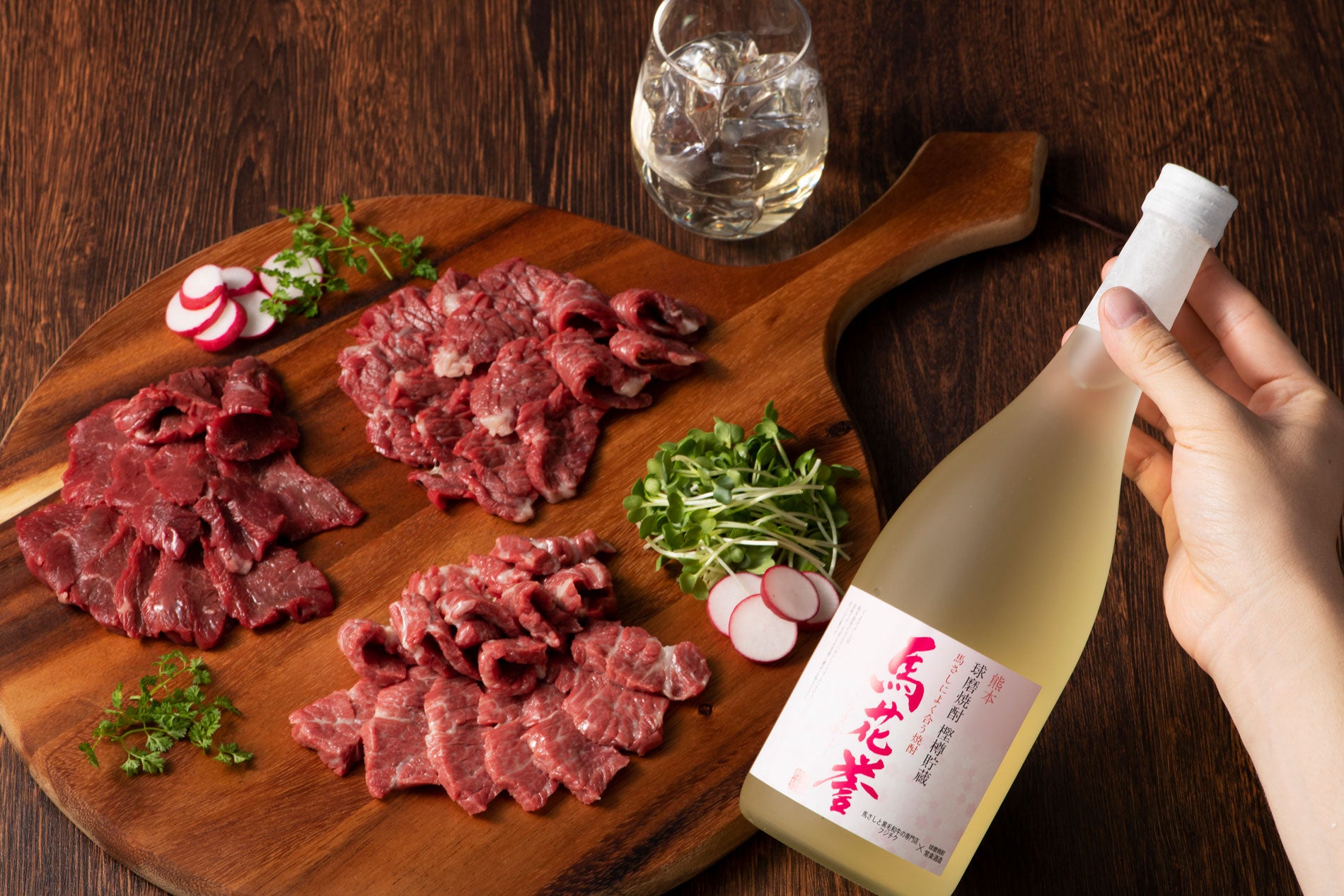 「馬刺しに合う焼酎を!」という思いで作られたオリジナル焼酎「馬花誉-うまかよ-」と創業40年のフジチクのこだわりが詰まったふじ馬刺しの大トロ・中トロ・上赤身の霜降りと赤身の両方が堪能できる大人気ギフト商品です。