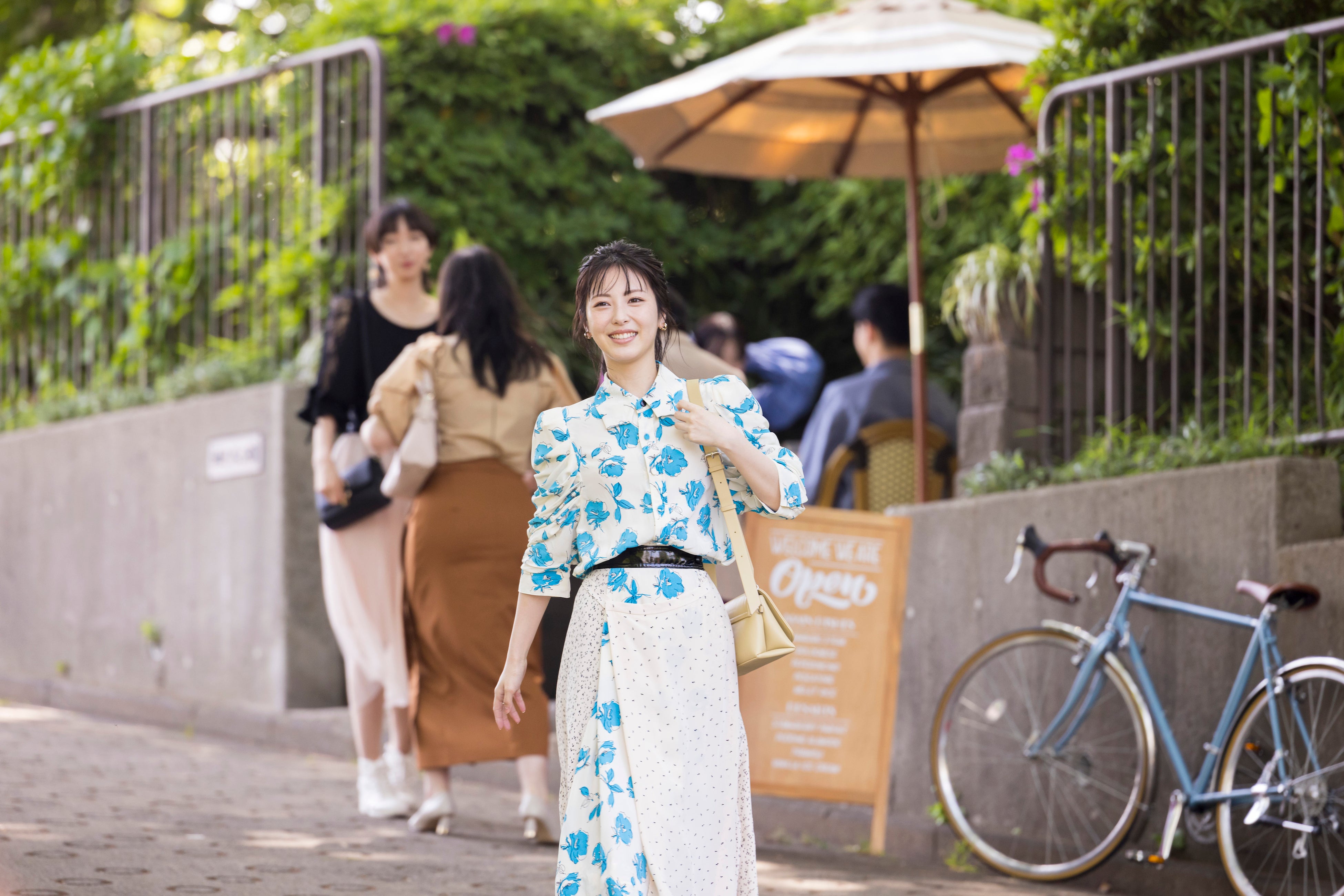 雲ひとつない清々しい晴天となった撮影当日。その日の青空のように爽やかなブルーの花柄ワンピースに、スリット入りのドット柄スカートを重ね、黒いウエストベストを締めた涼しげな衣装で現場入りした浜辺さん。陽射しを浴びながら、「気持ちいい日~!」と気分も上がり、撮影が始まりました。