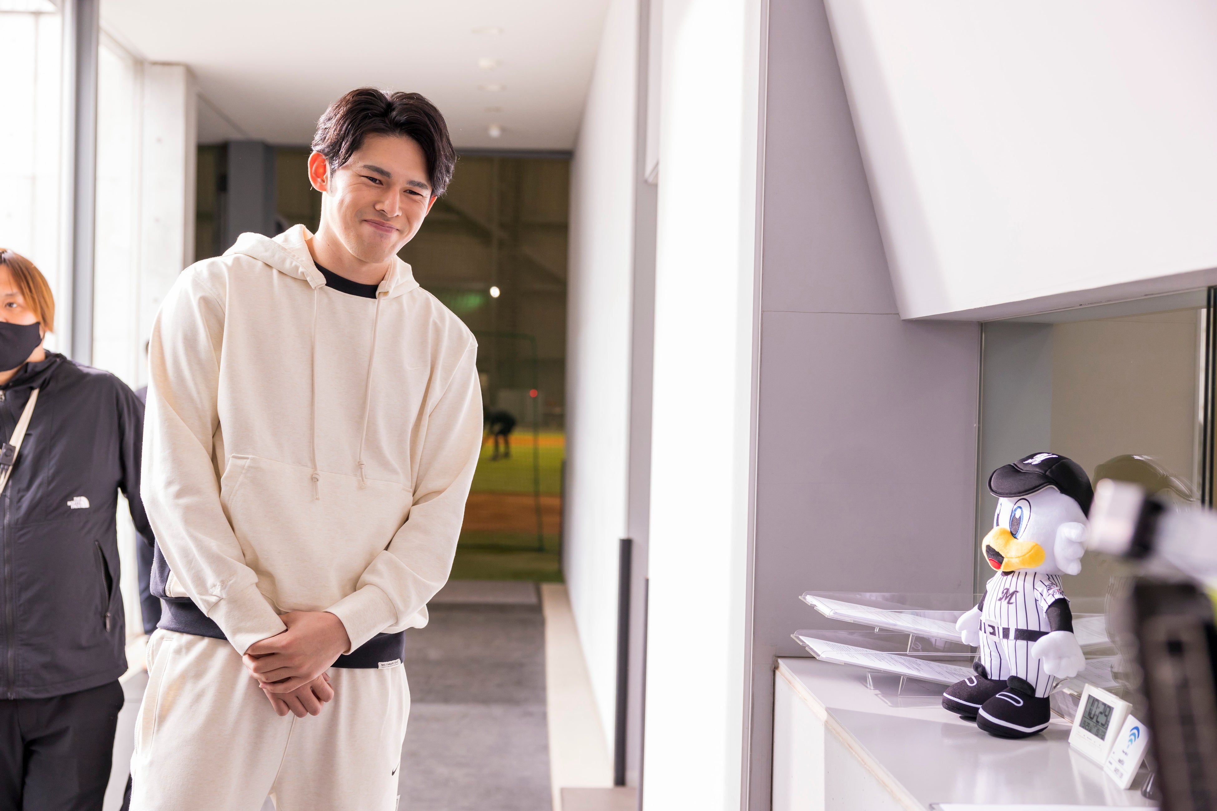 トレーニングを終えて練習場をあとにする佐々木選手。「グリーンガム」を口に入れ、リラックスした表情でゆっくりと歩きながら周囲の選手やスタッフに「お疲れ様です!」と礼儀正しくご挨拶。野球界では「令和の怪物」と呼ばれている佐々木選手ですが、マウンドを離れれば、目についたゴミを拾って清掃スタッフに手渡したり、受付デスク上で倒れていた球団マスコットキャラクター「マーくん」のぬいぐるみをもとの位置に戻してあげるなど、普段は物腰の柔らかい、優しい青年なのです。
