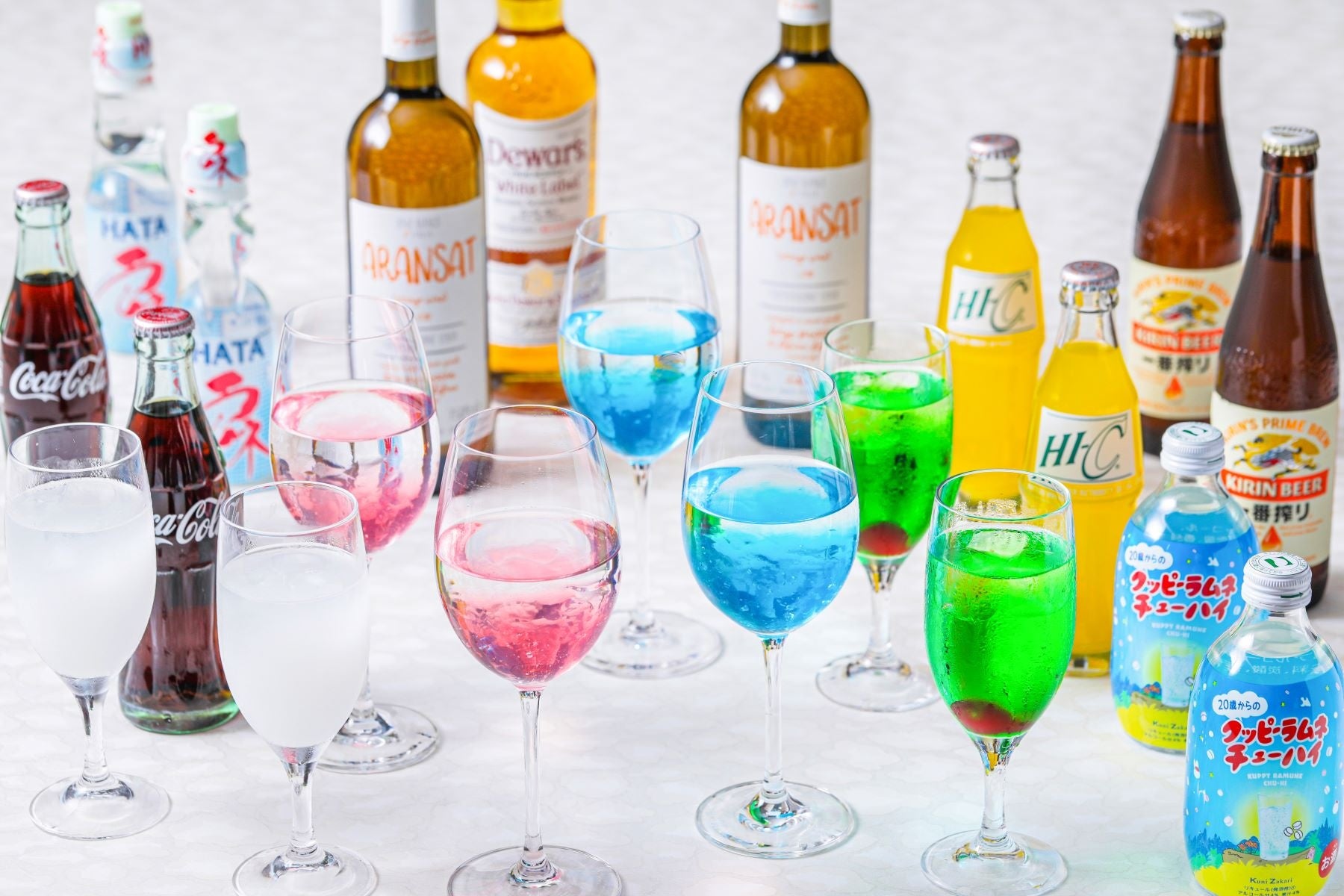 生ビール/オレンジワイン/ウイスキー/メロンソーダ/カスピス/カラフルゼリードリンク2種/コーラ(瓶)/ラムネ(瓶)/オレンジジュース(瓶)/クッピーラムネチューハイ(瓶)/ウーロン茶/ホットコーヒー/アイスコーヒー
