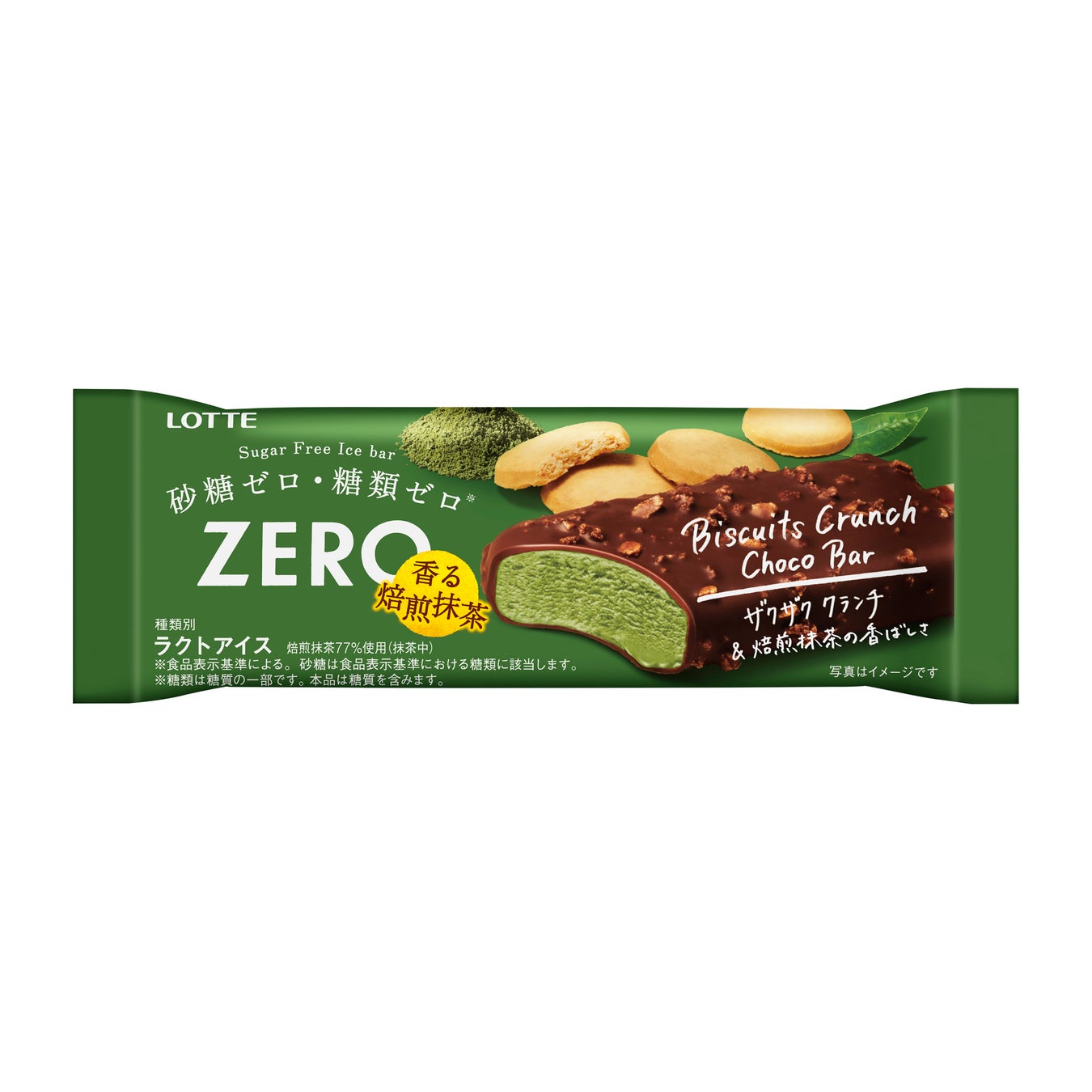 砂糖ゼロ・糖類ゼロでおいしく、ビスケットクランチのザクザク食感と焙煎抹茶の香ばしい香りと深みのある味わいが楽しめる抹茶アイスです。