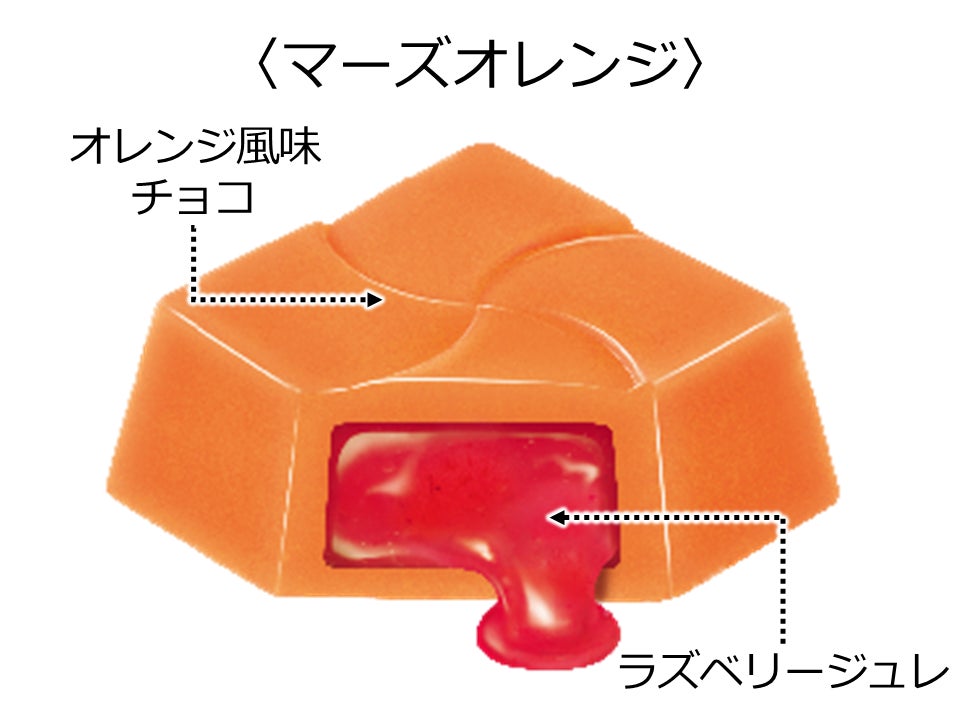 赤い「火星」イメージし、鮮やかなラズベリージュレをオレンジ風味チョコで包みました。火星には太陽系最大級の火山“オリンポス山“があることから、情熱的な色で仕上げました。