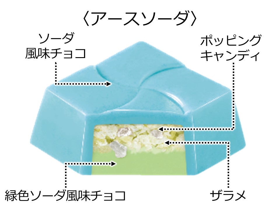 水の多い「地球」をイメージし、パチパチとはじけるポッピングキャンディとザラメをソーダ風味チョコで包みました。ポッピングキャンディは動物などの生命活動エネルギーをイメージしています。