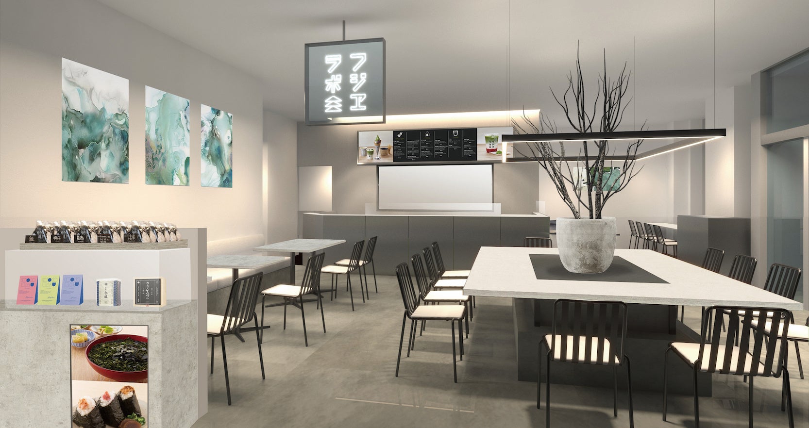 『フジヱラボ エキュート立川店』は、通勤・通学やショッピングなどで多くの人が行き交うJR東日本 立川駅構内にあるエキナカ商業施設「エキュート立川」内に出店します。店舗は、立川駅を利用するお客様がショッピングや目的地への移動の合間に束の間の休息を取ることができる“Quick & Comfortable”な空間を目指し、店内に36席の客席を配置します。過度な装飾はせずシンプルな世界観を表現した店内は、ご来店いただいたお客様が少しの間、心と体をリセットして、フレッシュな気持ちで次の目的地に向かうことができるような空間を目指しました。