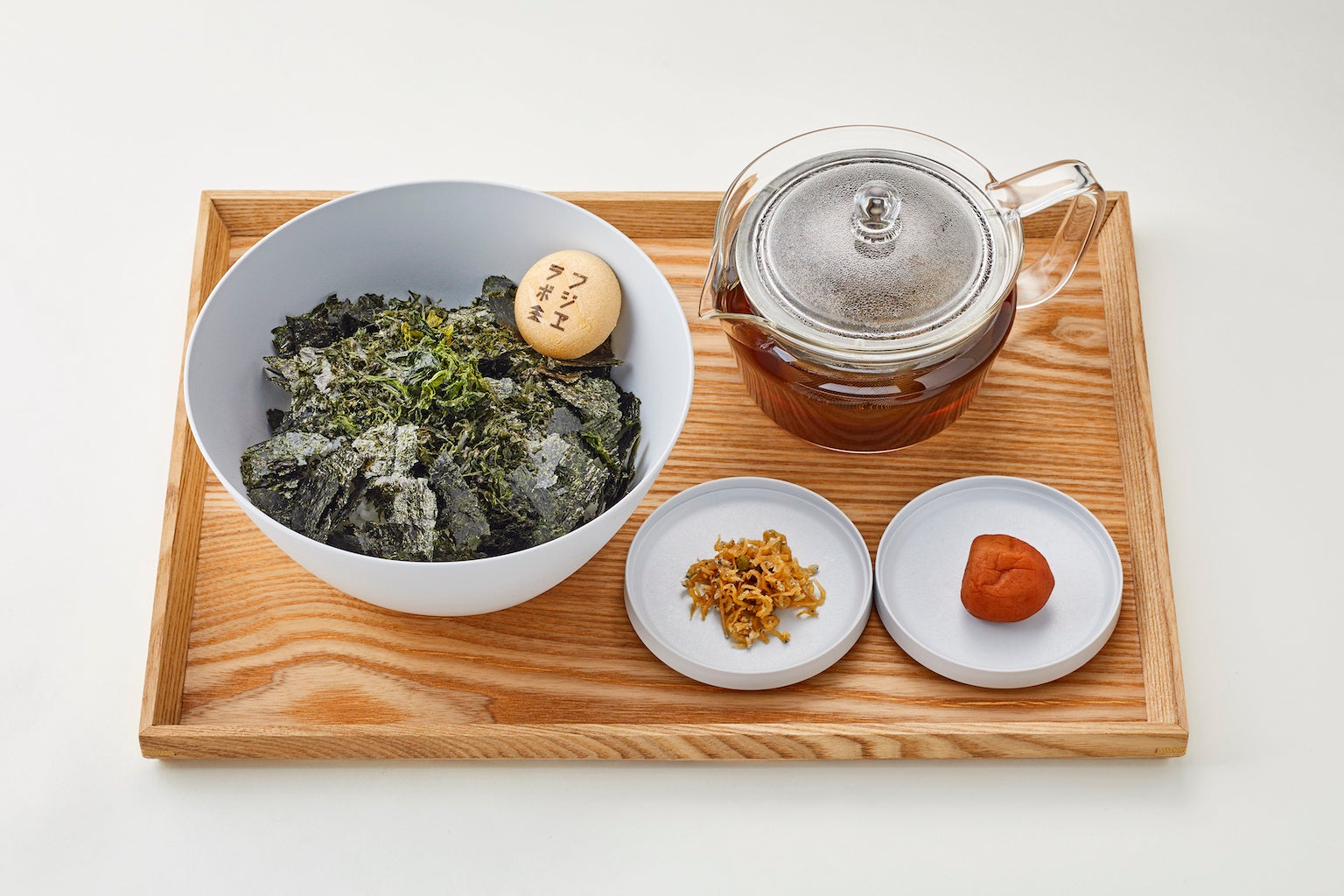 九州・有明海産の板海苔、あおさ海苔、ばら干し海苔という食感の違う3種の海苔を使用したお茶漬けで、上質な海苔を贅沢に味わう『フジヱラボ エキュート立川店』の看板メニュー。かつお節、昆布、椎茸で取った出汁を山本山のほうじ茶で合わせたオリジナル「ほうじ茶だし」でお召し上がりいただきます。