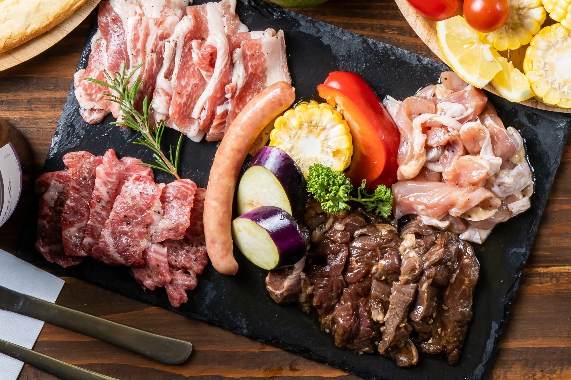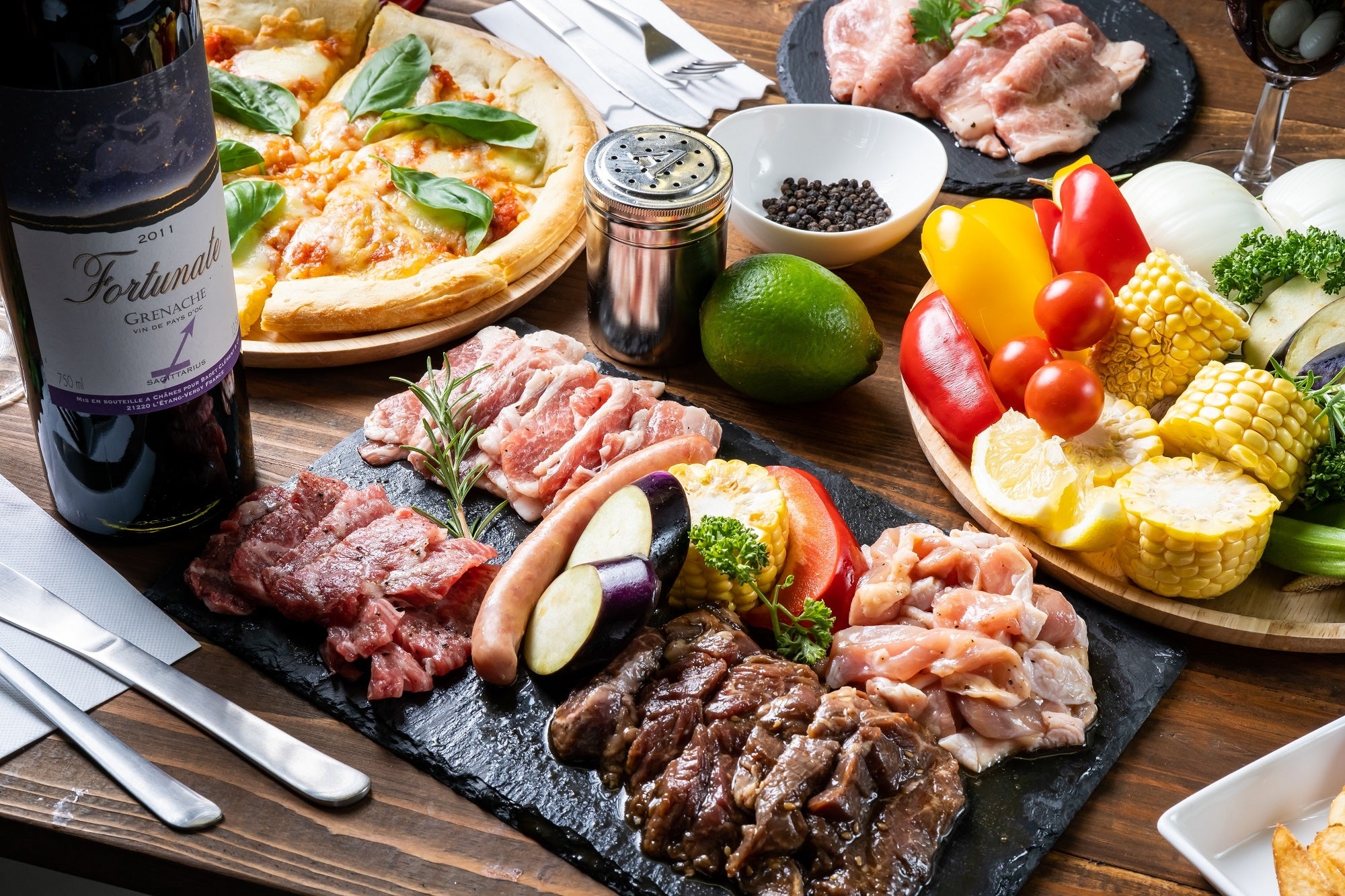 お肉を中心にフード6種、BBQコースを2種類、ソフトドリンクやビールを使用したビアカクテルなど全12品をご用意。