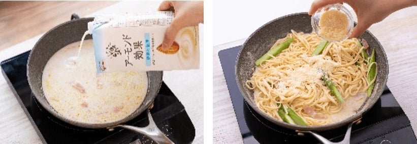 そのまま飲んでもおいしくお召し上がりいただけるのはもちろん、料理に使用することで、手軽にコクを与えてくれるアーモンドミルク。