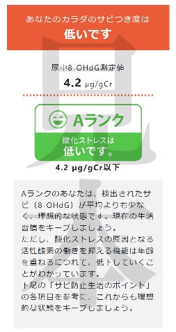 そこで、今回、自分の内部の状態を把握して、生活習慣を見直すためのヘルスケアチェックとして、数量限定で酸化ストレス検査「サビチェック」付きモニターキャンペーンを企画しました。この検査では、酸化ストレスの結果を具体的な数字で見ることができます。日々の食生活や生活習慣を改善するモチベーションにもつながると思います。