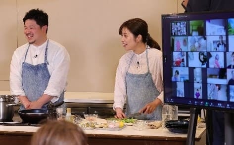 レシピの一般公開に先行して、5月19日にGlicoの会員コミュニティ「with Glico」でオンラインクッキングイベントを開きました。 「ぐっち夫婦と一緒に作ろう!アーモンドミルクを使ってつくる適正糖質パスタ!」と題し、全国から40名を超えるwith Glico会員が自宅のキッチンからPCやスマホで参加しました。都内のクッキングスタジオで調理をするぐっち夫婦の説明を聞きながら、一緒に調理しました。