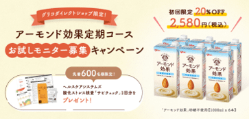 そのほかにも、「アーモンドミルクの日」にあわせてアーモンドミルクの魅力に触れ、飲み続けていただくための、さまざまな企画を実施予定です。アーモンドミルクをまだ飲んだことがない方にもおいしさを実感いただくため、5月下旬からは全国のスーパーやジム・美容サロン等で試飲企画を展開します。また、グリコダイレクトショップでは、「アーモンド効果」定期コースお申し込みのお客様先着600名様に初回限定で酸化ストレス検査「サビチェック※3」付きのモニターキャンペーン※4を実施します。