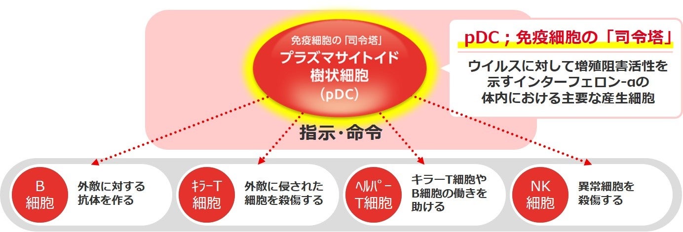 そこで当社は、免疫細胞の司令塔であり、重要な機能を有するプラズマサイトイド樹状細胞(以下pDC)に着目しました。pDCは、ウイルスや病原性細菌を確認すると活性化し、体内でインターフェロン-αという物質を生み出します。これが複数の免疫細胞を活性化することで体内の免疫機能を広く活性化することができるため、安全性の高い乳酸菌でpDCを自由に活性化できれば、ウイルスの種類によらず、体内でウイルスに対する抵抗力を高めることができると考えました。