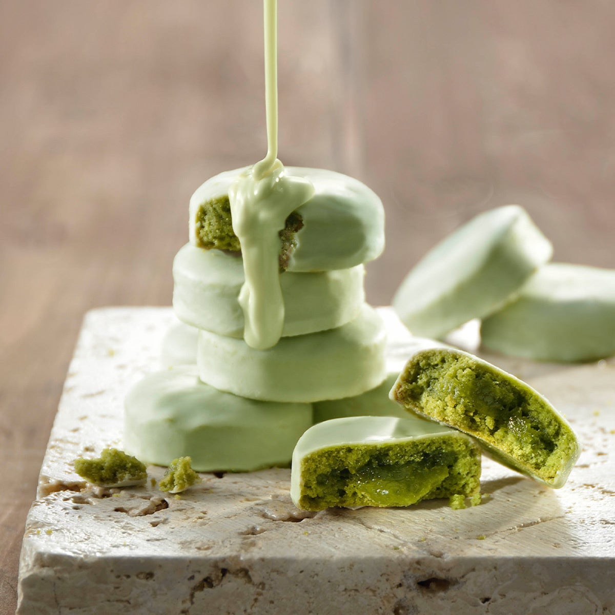 宇治抹茶とイタリア産ホワイトチョコレートを練り込んだガレット生地の中に 宇治抹茶クリームを入れ焼き上げ、ホワイトチョコでコーティングしました。2種類の抹茶の贅沢な味わいをホワイトチョコレートで閉じ込めた一品です。