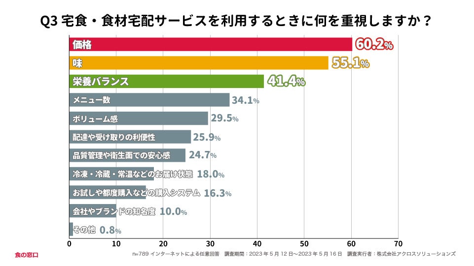 宅食・食材宅配サービス利用の際に、今後重視したいと思っている項目で最も多かったのは「価格」で60.2%でした。