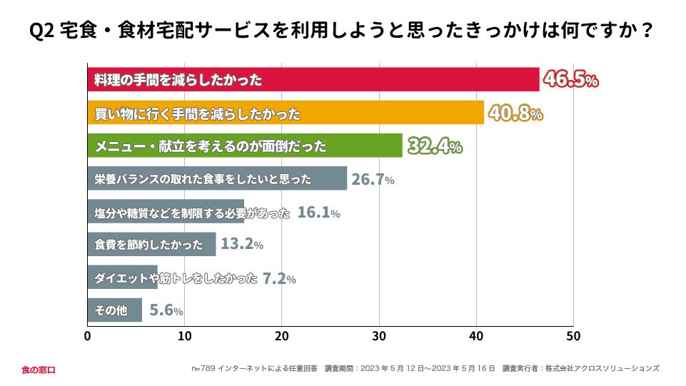 Q2 最も多かった「料理の手間を減らしたかった」の46.5%をはじめとして、時短や自炊を避けるためのツールとして宅食サービスが利用されている傾向が強かった。
