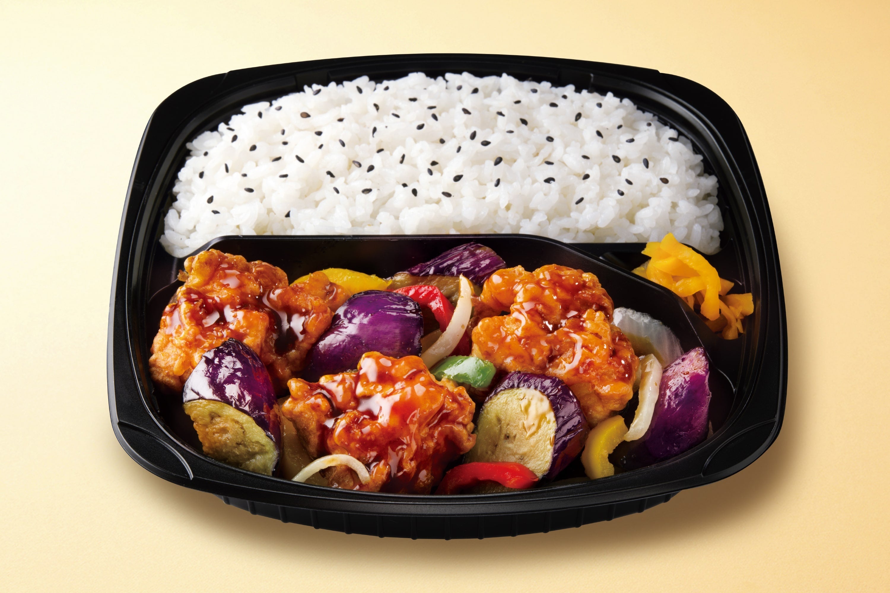 鶏の唐揚げと夏野菜の『なす』を使った『鶏となすの黒酢あん弁当』が期間限定で登場。