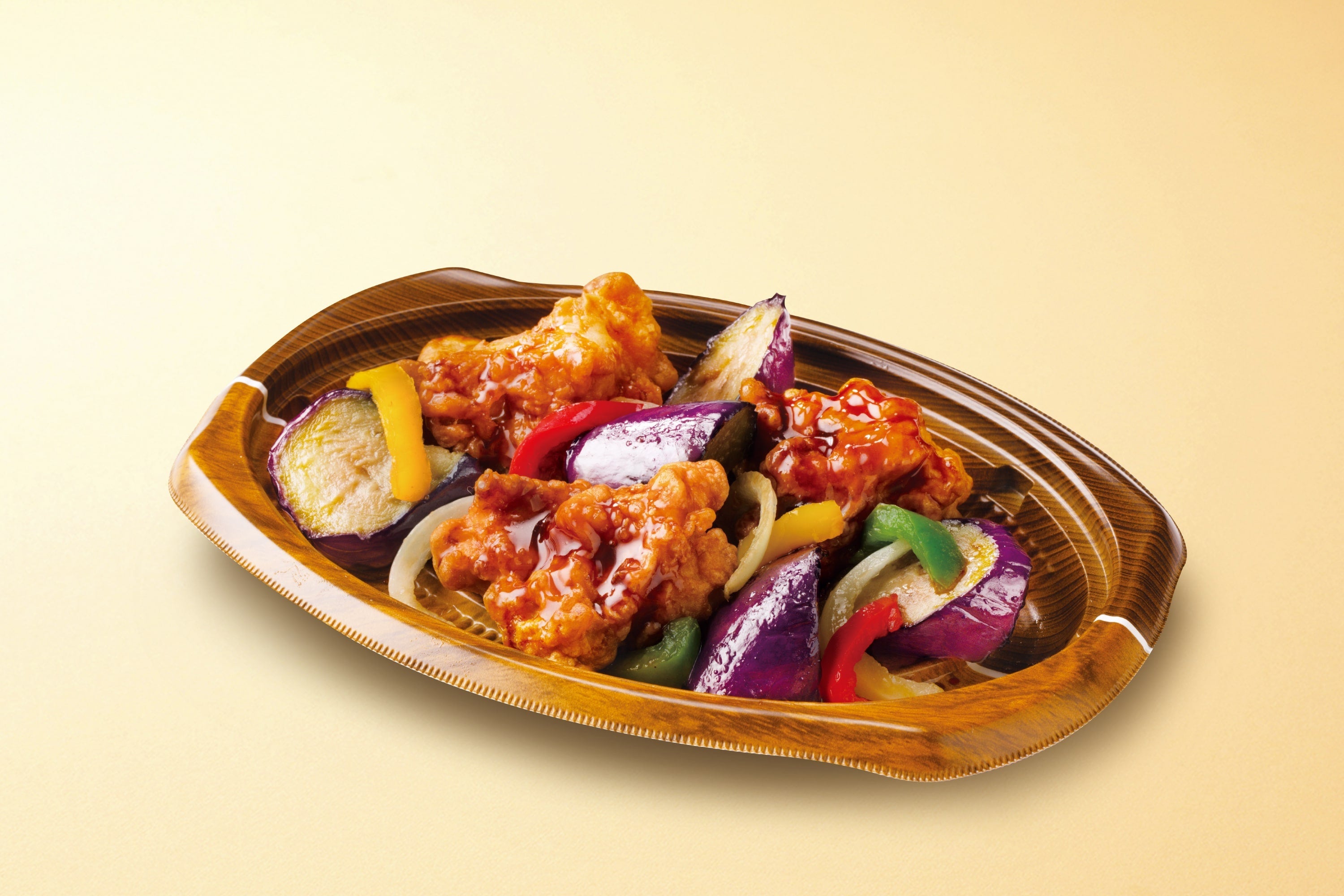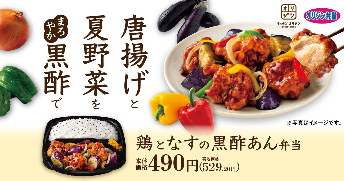 オリジンの人気商品である『若鶏のこだわり醤油唐揚げ』を使用し、素揚げした夏野菜のなすや3色のピーマン、玉ねぎと一緒に黒酢あんに絡めて仕上げました。