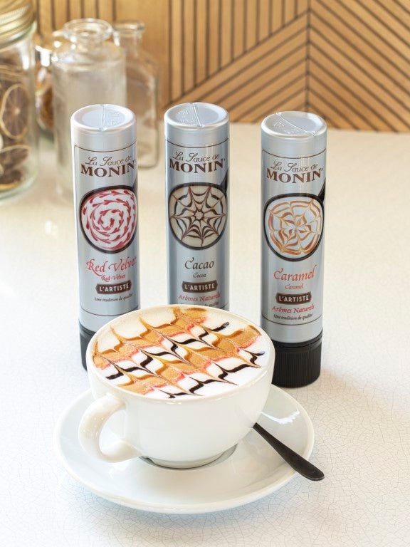 モナン ラティスト レッドベルベット・ソースはすでに発売されているココア・ソース、キャラメル・ソースに続く、3アイテム目の発売です。きれいな淡い赤色で容器の注ぎ口がペン型かつ握りやすいため、鮮やかな線を描きやすく、この他ラテアートのミルクフォームにソースが沈みづらい、にじみづらいなどの特長がございます。