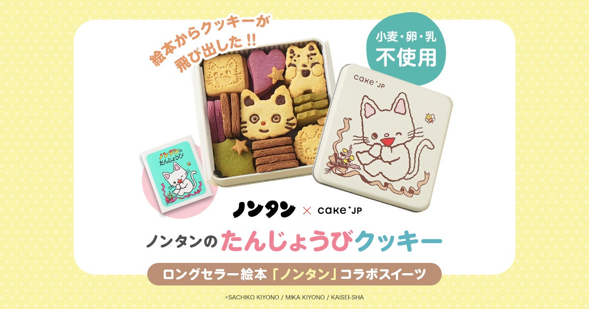 1976年の刊行以来45年以上も愛され続ける人気絵本「ノンタン」シリーズ。今回Cake.jpは、お子さまへの絵本の読み聞かせをしながら、その絵本に登場するお菓子を実際に食べることで、大人も子どももよりノンタンの世界観を楽しめる体験ができるようにという想いから、同シリーズとのコラボを実現しました。この商品は、絵本『ノンタンのたんじょうび』に登場するノンタンの友だちがノンタンのために手作りしたクッキーをそのまま再現しつめこんだクッキー缶です。缶の表面には絵本の表紙がデザインされています。