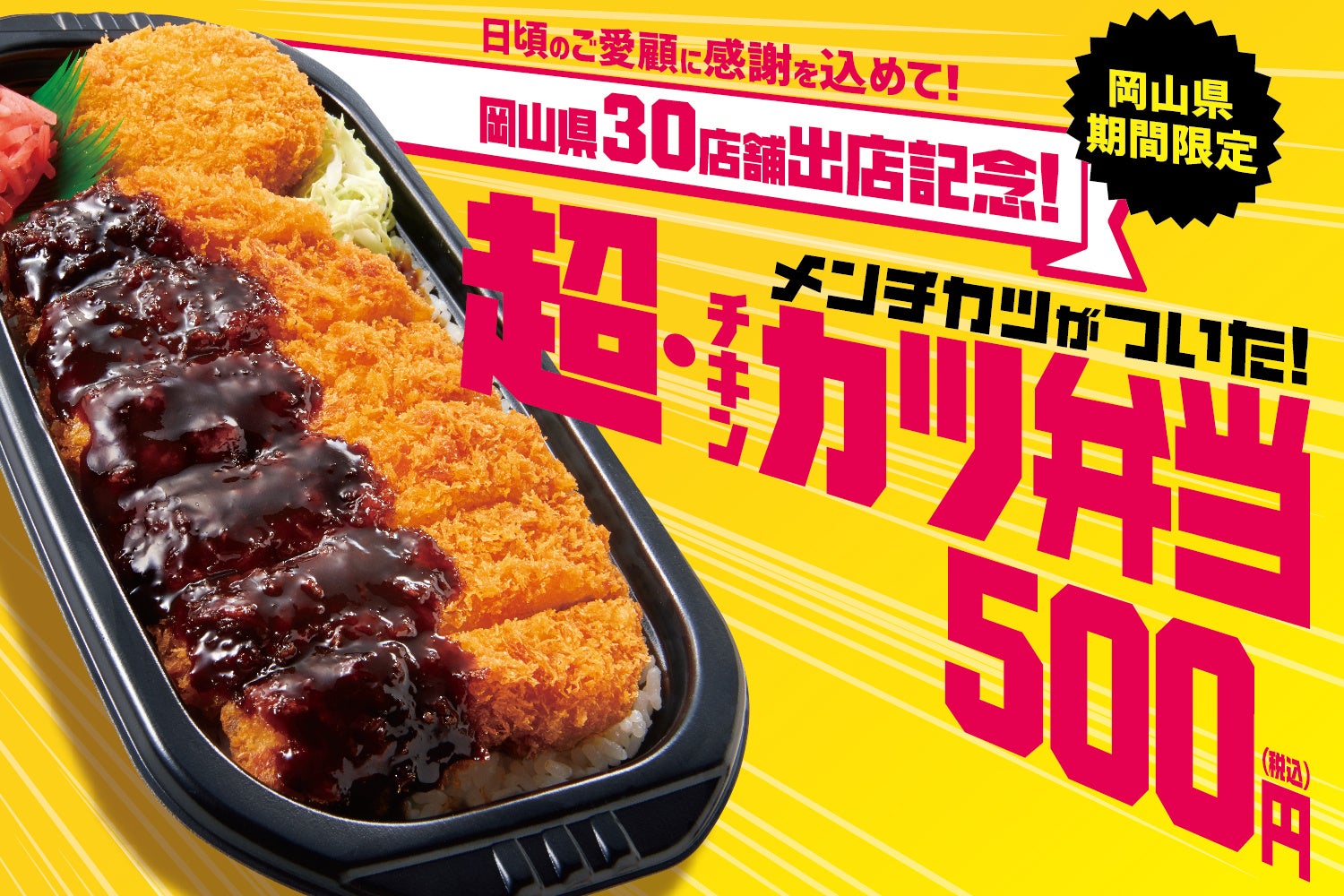 衣のサクサクとした食感と、しっとり柔らかな肉質が特徴で国産の鶏むね肉を使用した大きなチキンカツにメンチカツを組み合わせた『超・チキンカツ弁当』をワンコインの500円で販売いたします。岡山県限定の『超・チキンカツ弁当』は、およそ1ヶ月の期間限定販売となります。ぜひこの機会に、岡山県のほっともっとをご利用ください。
