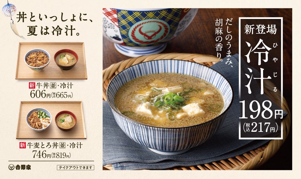 株式会社吉野家(本社:東京都中央区、代表取締役社長:河村泰貴、以下吉野家)は、6月1日(木)11時より全国の吉野家店舗※で、夏季限定商品『牛皿麦とろ御膳』648円(税込712円)、『牛麦とろ丼』548円(税込602円)に加えて、今年新登場となる『冷汁』198円(税込217円)を販売開始します。いずれの商品もテイクアウトでも利用可能です。